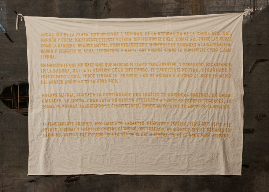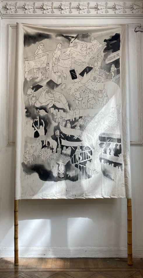 Colón y Cañada – Lienzo, pintada con látex negro y sostenida con cañas tacuara. – 450 x 200 cm. – 2021