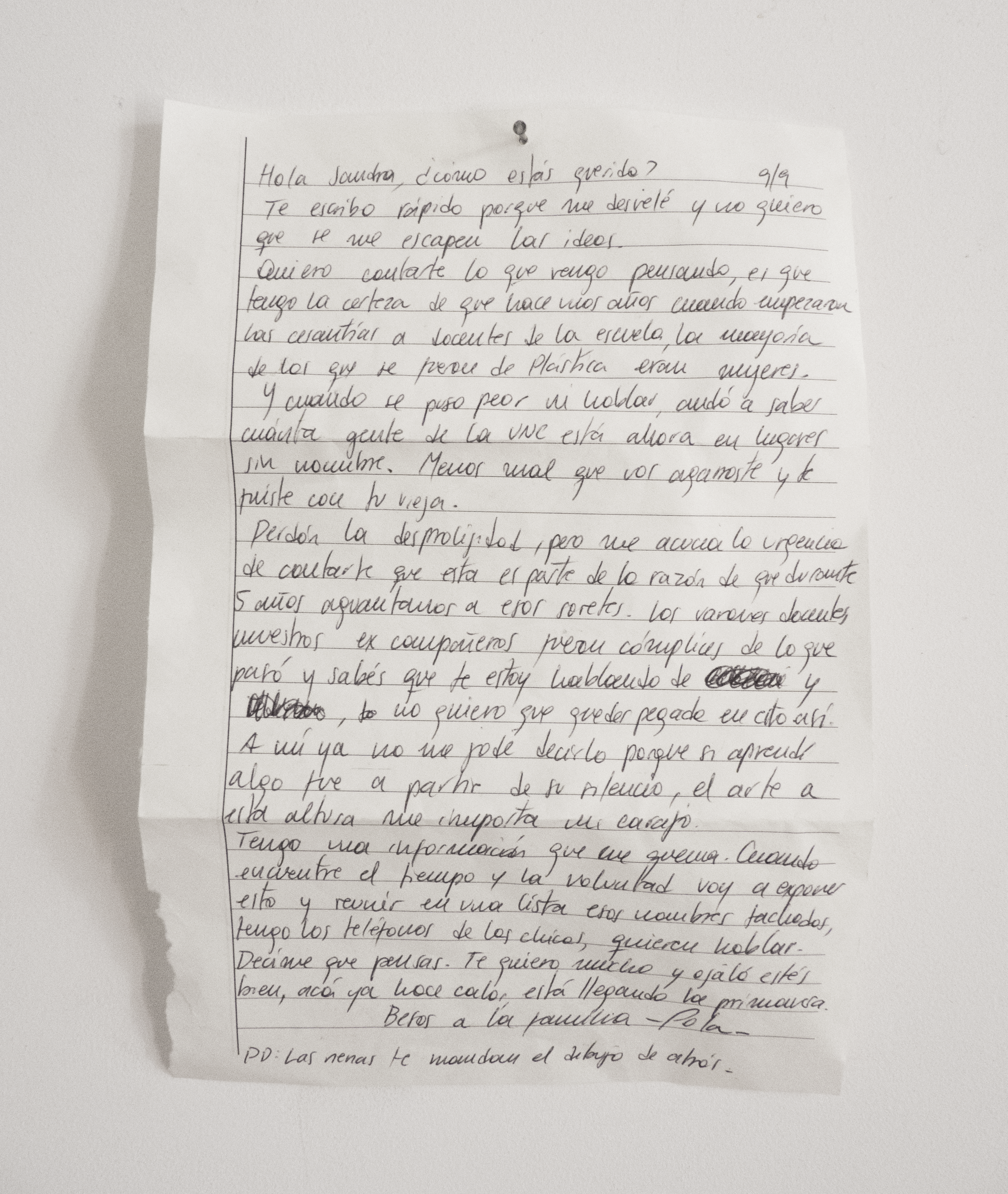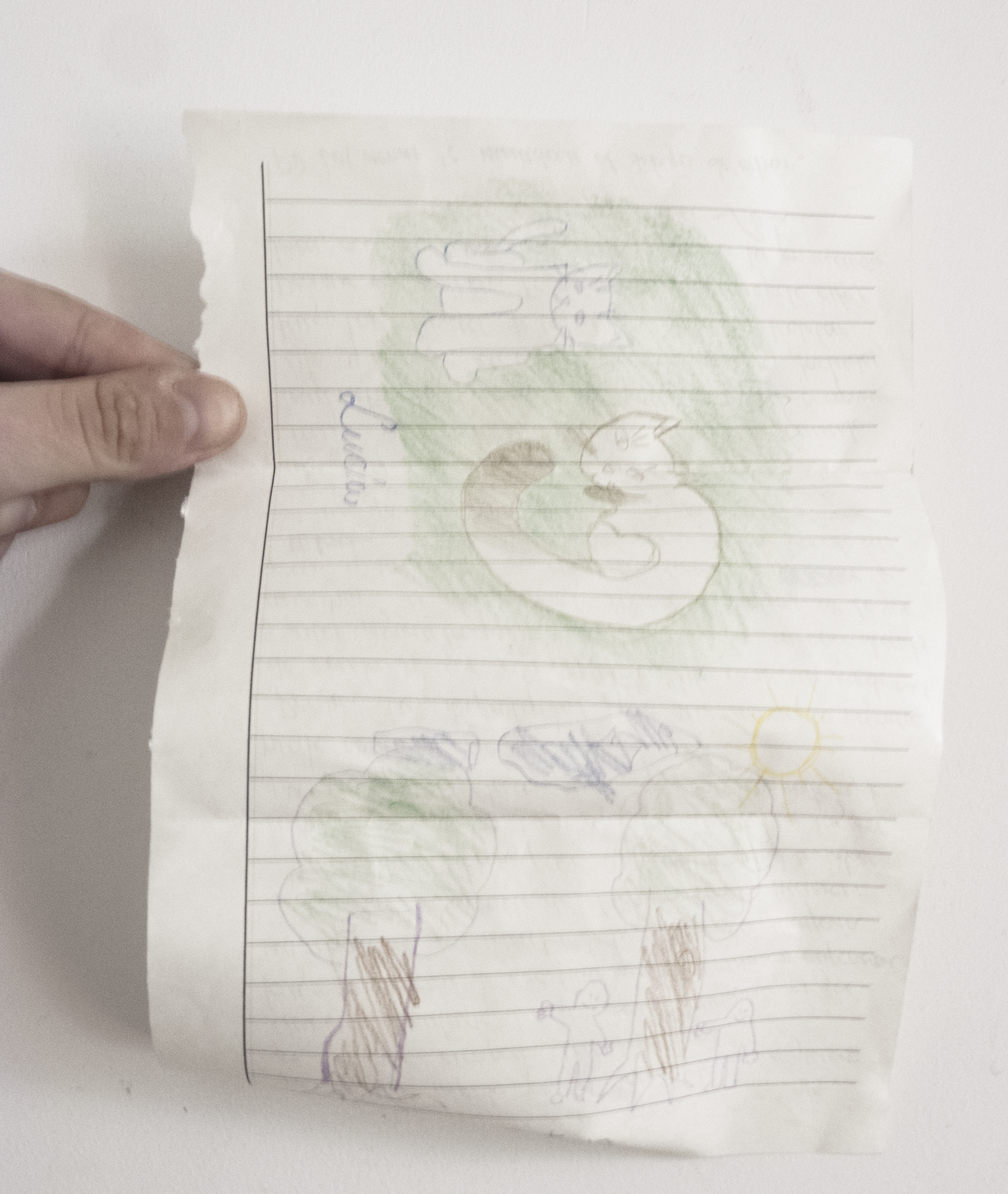 Carta – Hoja de cuaderno escrita con lapicera y dibujado en el dorso con lápiz de grafito de colores – 15 × 21 cm. – 2021
