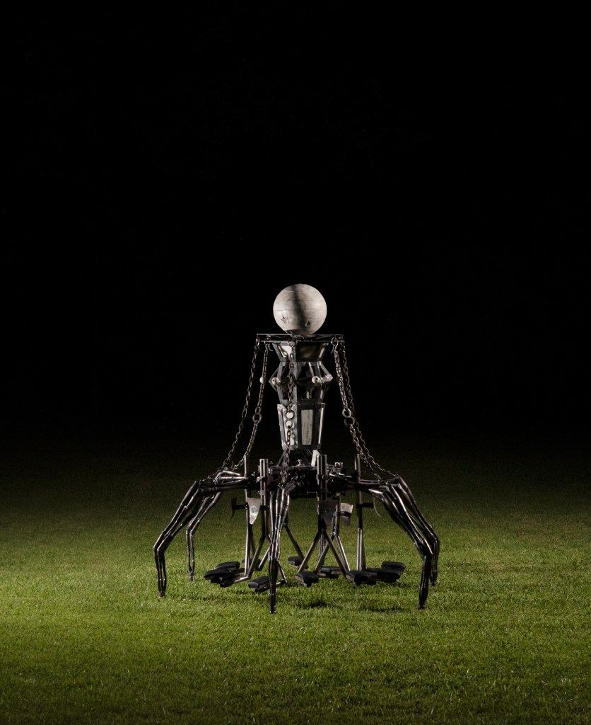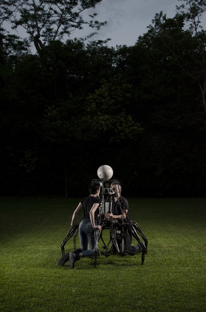 El centro del portal se encuentra conectado a los apoyapies y estos pendulan sobre la base, por lo cual el peso corporal de los participantes y los movimientos que generan en este ritual afectan la inclinación de la pieza.